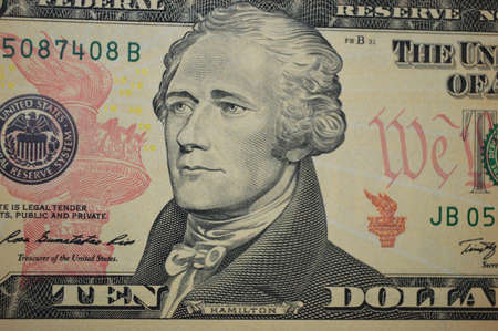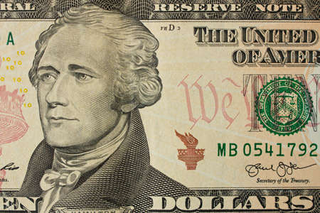 Macro shot of Alexander Hamilton on the U.S. Ten dollar bill.
