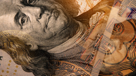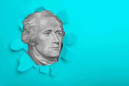 Closeup of Alexander Hamilton portrait in perspective on 10 US dollar bill