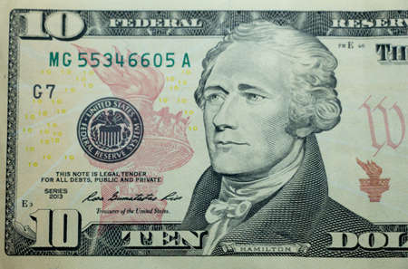 Ten dollar bill (10 usd) closeup macro, Alexander Hamilton portrait, united states money close up, 2013 series