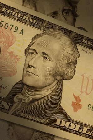 Portrait of Alexander Hamilton on the 10 dollar bill. Close up.