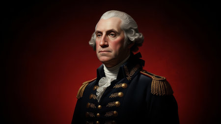 George Washington portrait in military uniform on red backdrop.