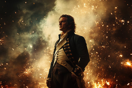 A heroic figure in a dark military uniform stands confidently as vibrant sparks and smoke engulf the background. The atmosphere conveys tension and excitement, creating an epic visual experience.