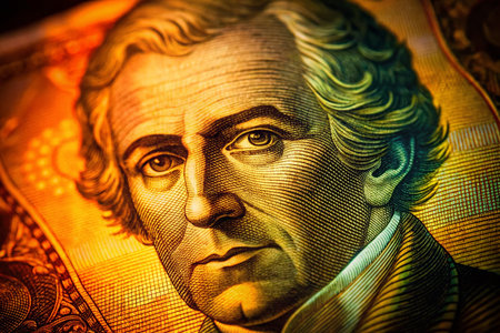 Close-up of Andrew Jackson on the $20 bill, dramatically lit.