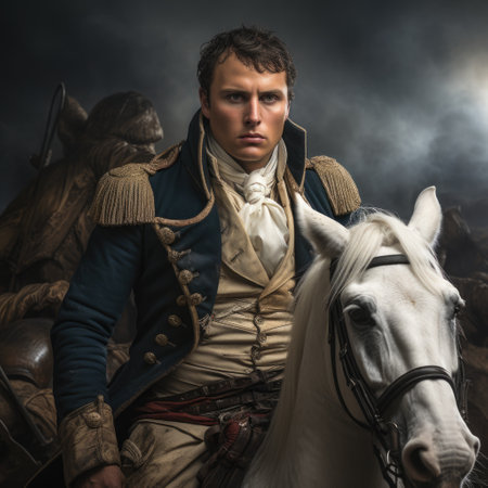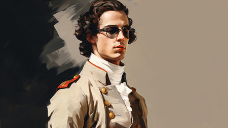 a portrait of a man in military uniform, depicted in a digital painting and drawing style. the artwork showcases a baroque influence with iconic american elements. the color palette consists of dark white and light orange tones, adding a classicist touch. the image has a low resolution, featuring youthful protagonists. ai generated