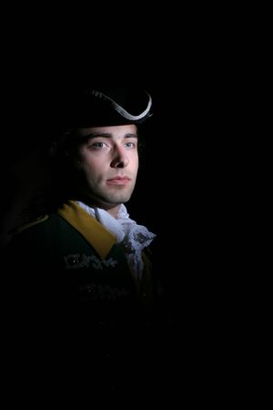 Man in historical attire, dark background, powdered wig, formal.