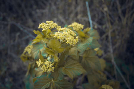 Beautiful fairy dreamy magic red pink flowers with dark green blue leaves, blurry background, toned with filter in retro vintage color pastel, soft selective focus, shallow depth of field