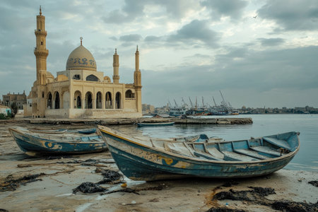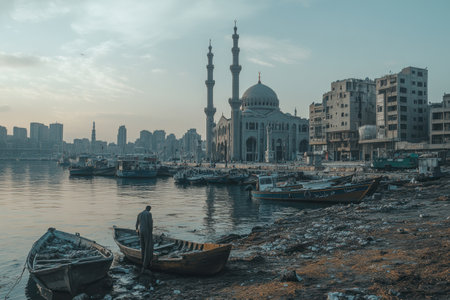 A photo of the modern city port in Sh勇a, Egypt with many boats and fishing ships docked along its shore line. In front is an Arabic style mosque, with two minarets on top of it, surrounded by other buildings. The sky above has light clouds, and there's water around the area. A fisherman stands at his boat near him looking out to sea. It was taken during daytime, with natural lighting casting shadows over everything. This scene captures real-life scenery in warm colors. --ar 3:2 --v 6.1 Job ID: 14ce2f90-b20b-4824-87e3-ae2dcc172583