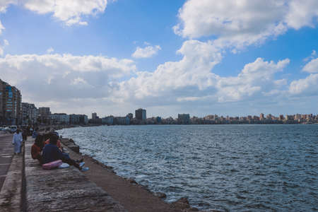 ALEXANDRIA, EGYPT - DECEMBER 17, 2017: The seaside walking area in Corniche avenue is the popular place among local students, spending their free time with friends there, on December 17 in Alexandria.