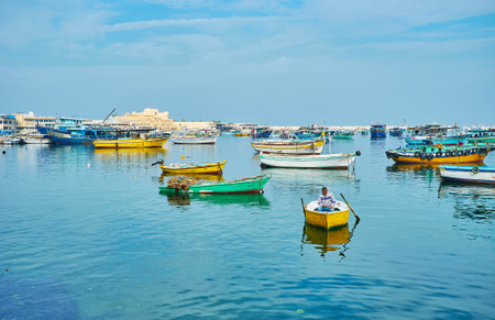 ALEXANDRIA, EGYPT - DECEMBER 17, 2017: The bright blue waters of Mediterranean sea in Eastern harbor with its old fishing boats, on December 17 in Alexandria.