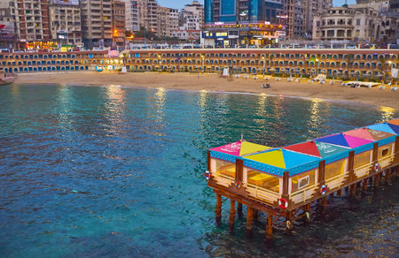 ALEXANDRIA, EGYPT - DECEMBER 17, 2017: The beautiful restaurant on water is located on Stanley bridge and offers tasty cuisine and romantic views, on December 17 in Alexandria.