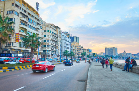 ALEXANDRIA, EGYPT - DECEMBER 18, 2017: Walk along 26 of July Road (Corniche), the most popular promenade of the city with historic mansions, old hotels, cafes and stores, on December 18 in Alexandria.