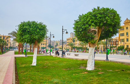 CAIRO, EGYPT - DECEMBER 22, 2017: Walk in park of El-Gomhoreya square, surrounded by administrative buildings and living quarters, on December 22 in Cairo.