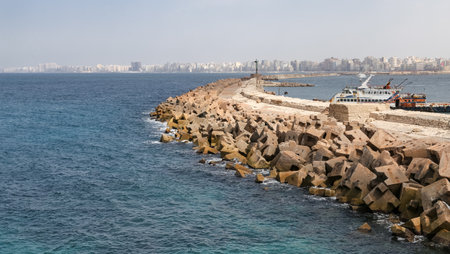 Seascape in Alexandria. A stone pier in the Mediterranean Sea, yachts are visible. In the distance, on the horizon, there is an embankment with city buildings. Blue sky with clouds. Egypt