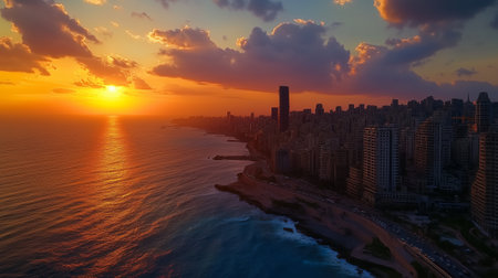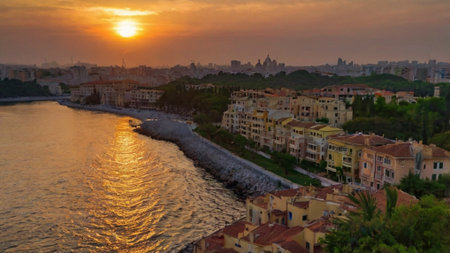 Stunning sunset over the coastline of a vibrant city, highlighting the blend of urban and natural landscapes during twilight hours