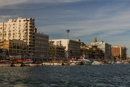 PORT SAID, EGYPT - FEBRUARY 3, 2019: Buildings by the Suez canal in Port Said, Egypt