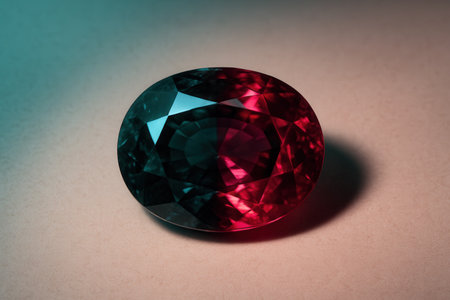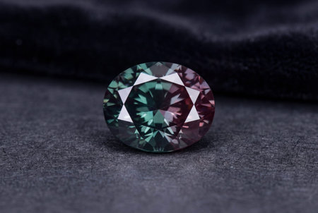 Faceted oval alexandrite gemstone exhibiting distinct green and purple hues rests on a dark textured surface often used for jewelry displays and luxury presentations.