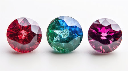Three identical-sized precious stones, Sapphire, Emerald, and Ruby, neatly placed in a row, showing their rich and deep hues against a white backdrop.