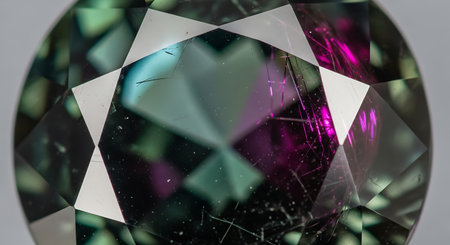 Luxurious round brilliant cut Alexandrite gemstone exhibiting vibrant green and purple colors under detailed close-up, highlighting its unique color-changing properties and high-quality cut