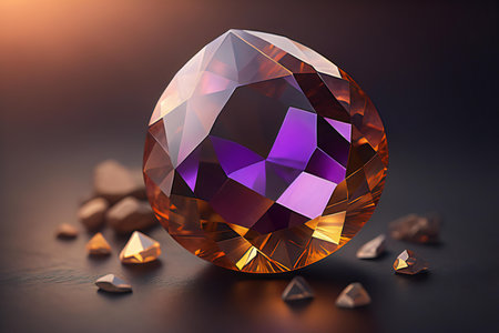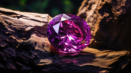 A detailed image showcases a faceted purple gemstone with sharp edges. The gem is illuminated, creating highlights and shadows. The dark background provides contrast, highlighting the gemstone's color and texture. Suitable for various design projects and commercial applications.
