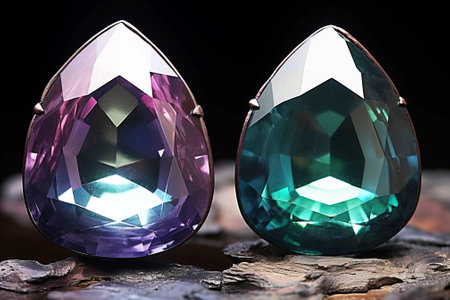 Emerald gemstone and purple sapphire top view over dark background. Generative AI illustration
