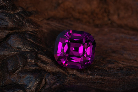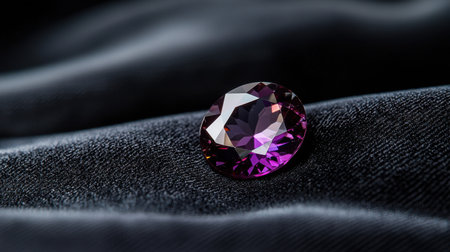 A purple gemstone sits on a black cloth. The stone is cut into a diamond shape and is surrounded by a black background