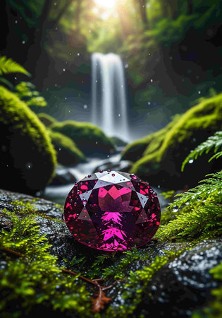 Beautiful pink diamond on green moss and waterfall background. 3D rendering