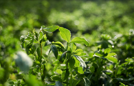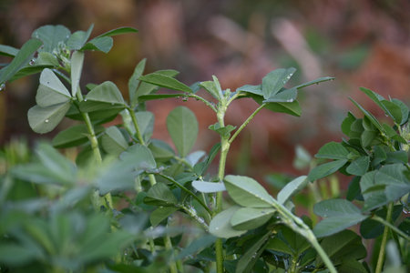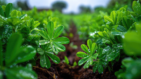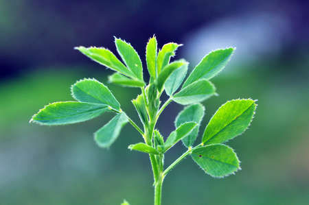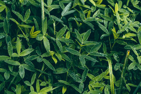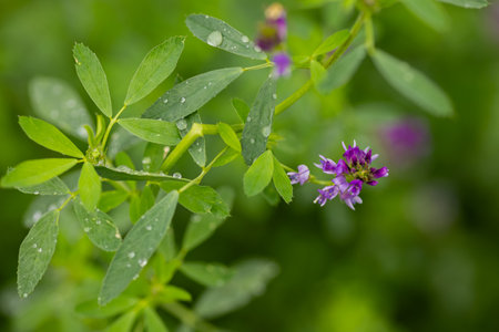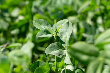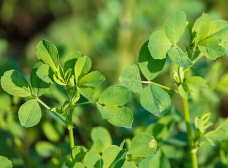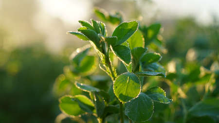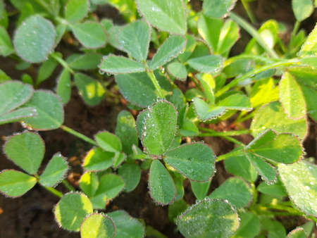 Alfalfa plant with leaves covered with dew drops on field close-up in morning on a blurred background