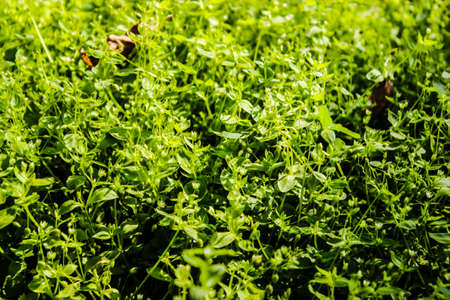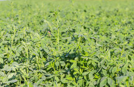Young green alfalfa grows on a farm field. Growing fresh greens. Texture of young grass. springtime.