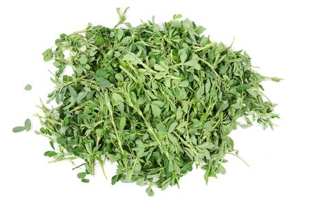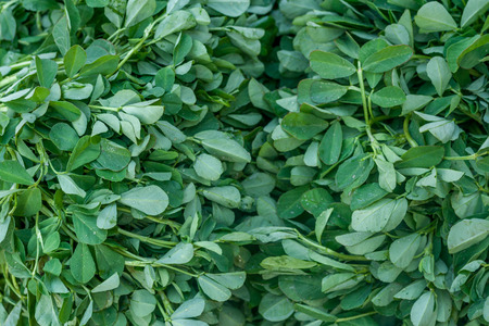 Fenugreek plant in field. Fresh Green Fenugreek Leaves. Green background. It is a most popular Greens and vegetable. Leafy vegetables. Its seeds and leaves are used in Indian food.