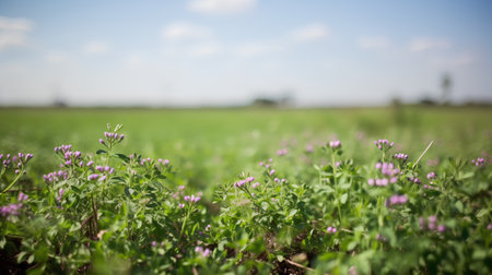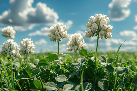 A cinematic photograph of clover and grasses in a field, with a blue sky, white flowers, and green leaves. The camera angle is from ground level, looking up at the clouds, with a shallow depth of focus. The image was shot on an Arri Alexa Mini camera with a Zeiss Master Prime lens --chaos 30 --ar 3:2 --quality 2 --stylize 250 --v 6.1 Job ID: 527202d0-1e09-48ac-b5ef-6faca59fe015