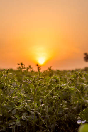 Field of the alfalfa covered with dew drops in summer morning at selective focus
