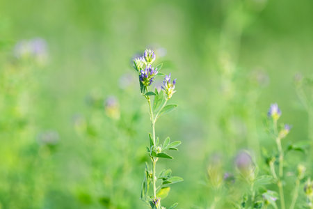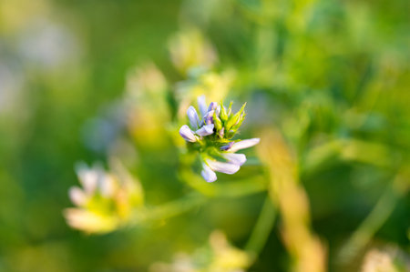 Stems of flowering alfalfa growing on the field on a blurred background of grass, close-up in selective focus