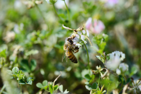 Hony bee flies around the flowers of Vicia (Vicia sp.) and collects nectar. Caucasus.