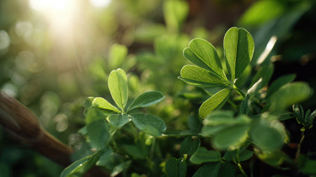 The Fenugreek leaf in spring, fresh green leaves, soft sunlight filtering, vibrant atmosphere full of vitality, natural textures, serene mood.