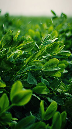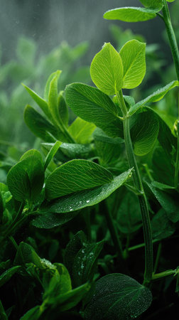 This captivating image showcases vibrant green plant leaves adorned with water droplets, highlighting nature's beauty and freshness. Perfect for various themes.