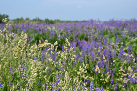 Galega officinalis in bloom. Beautiful violet flower field, nature landscape