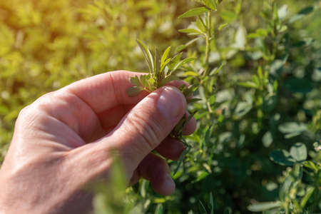 Farmer examining lucerne alfalfa crops in field, close up of male hand with selective focus