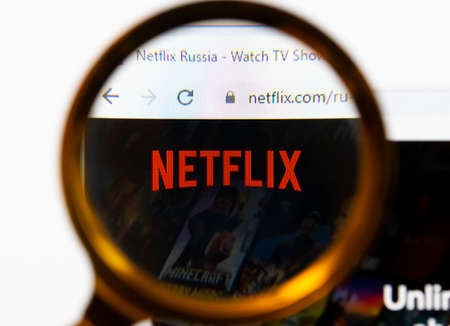 Moscow, Russia - 31 March 2021: View the Netflix homepage through a golden magnifier, company logo. High quality photo