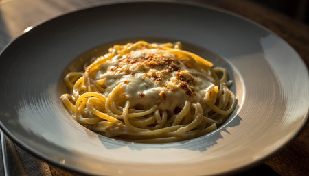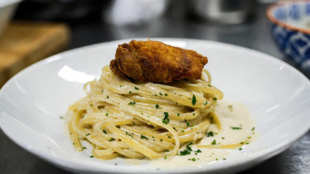 A beautifully plated bowl of spaghetti carbonara, showcasing rich flavors and a delightful creamy sauce, perfect for gourmet dining experiences.