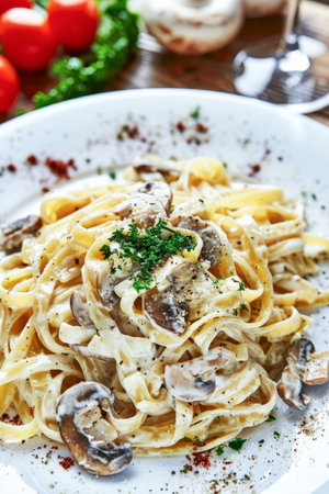 A serving of pasta is garnished with chopped parsley and sliced mushrooms. The creamy sauce coats the noodles, resting on a rustic wooden table surrounded by whole tomatoes, a pepper grinder, and condiments in the background, suggesting a home-cooked meal ready to be enjoyed.