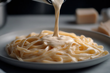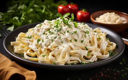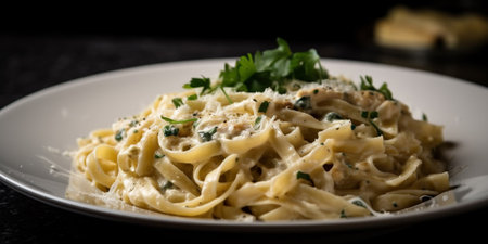 Fettuccine Alfredo Made With Tender Pasta Noodles Coated in a Rich and Creamy Parmesan Sauce. AI generated
