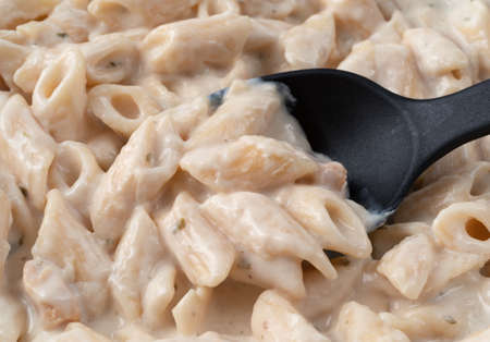 Pasta with chicken in an alfredo sauce with a black kitchen spoon in the food while cooking in a pan.