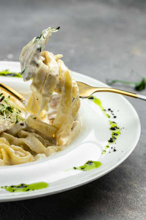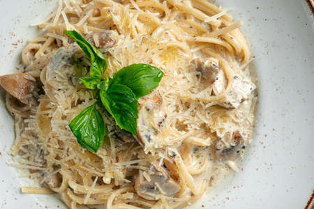 Pasta spaghetti in a creamy sauce with chicken and mushrooms. Italian food