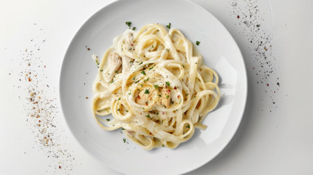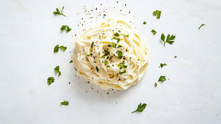 A deliciously styled overhead shot of creamy fettuccine pasta with Alfredo sauce, topped with an array of fresh herbs, captured against a clean white background for a fresh and appealing presentation.