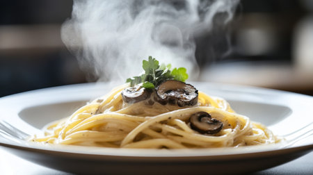 A steaming plate of spaghetti with a rich mushroom and truffle cream sauce, elegantly plated on a ceramic dish.