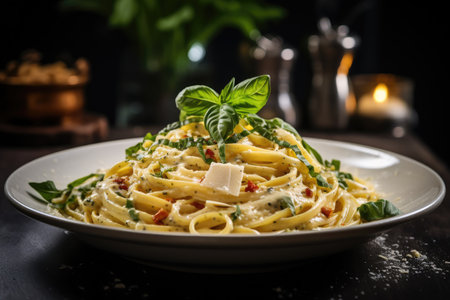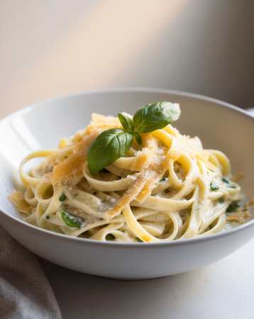 AI Generated. Creamy Pasta with Fresh Basil and Cheese in Bowl