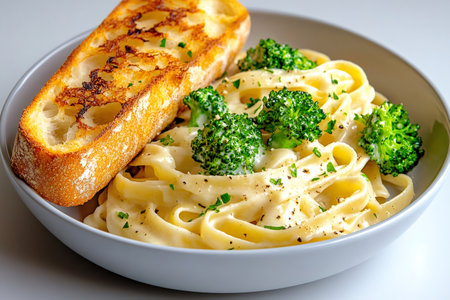Fettuccine pasta with creamy alfredo sauce, broccoli and toasted bread seasoned with parsley and pepper in a gray bowl