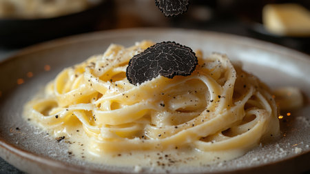 Truffle Shavings on Fresh Pasta - Thin slices of black truffle being delicately shaved over a plate of handmade fettuccine, butter sauce glistening.