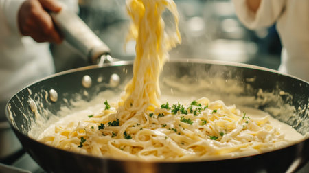 A chef skillfully tossing creamy pasta in a pan, showcasing the rich textures and ingredients. The dish is prepared with fresh herbs, creating an inviting culinary experience.