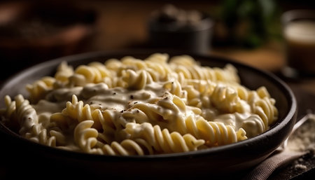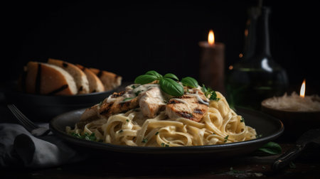 An AI-generated illustration of a bowl of delicious chicken alfredo pasta on the table